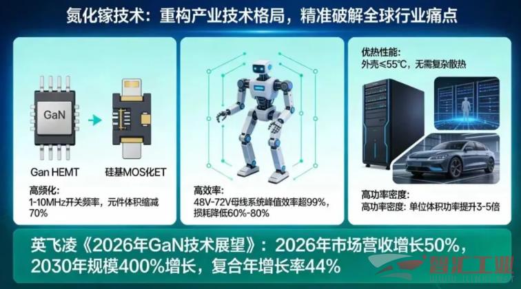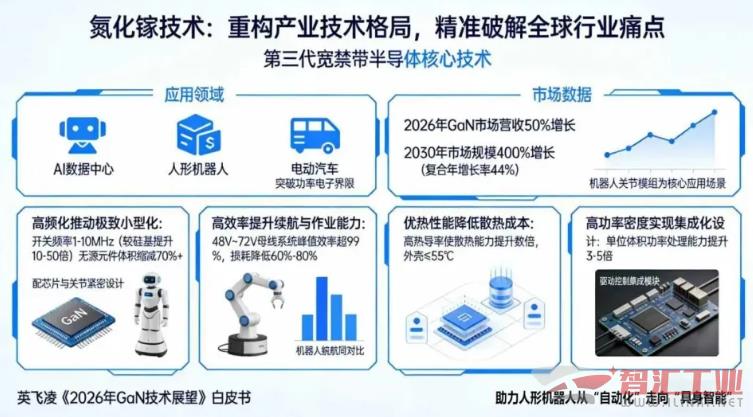 英飛凌在《2026年GaN技術展望》白皮書中明確指出,氮化鎵作為革命性創(chuàng)新技術,已在AI數據中心、人形機器人、電動汽車等領域突破功率電子界限,2026年GaN市場營收將實現50%增長,2030年市場規(guī)模較2025年實現400%增長,復合年增長率達44%,其中機器人關節(jié)模組成為GaN技術的核心應用場景之一。